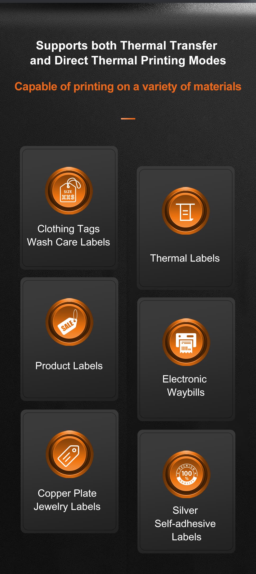 1. Supportsboth thermal transfer and direct thermal printing modes to meet various scenario requirements, capable of printing on a variety of materials including: clothing tags, wash care labels, product labels, copper plate jewelry labels, thermal labels, electronic waybills, and silver self-adhesive labels, etc., with clear and durable printing results, satisfying diverse printing needs."